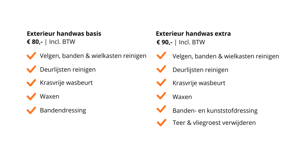 Zit je auto onder de modder, vogelpoep of saharazand? Wij bieden verschillende mogelijkheden voor het reinigen van het exterieur van jouw auto. De wasbeurt gebeurt veilig en zonder krassen door middel van de twee emmer methode. Onze werkzaamheden variƫren van een basis wasbeurt tot wheels off detailing.