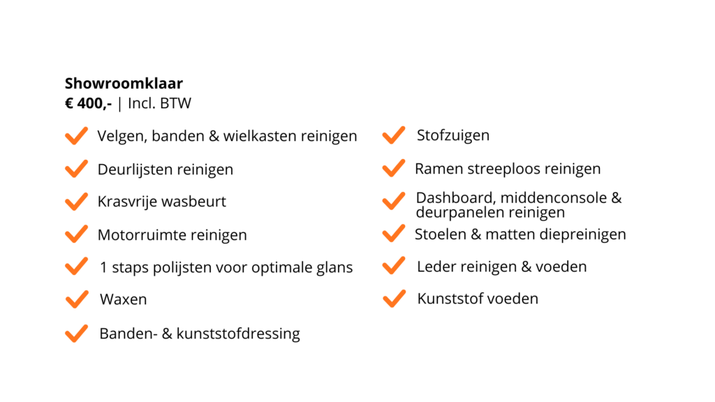 Wil je jouw auto weer laten stralen alsof hij net uit de showroom komt? Kies dan voor ons showroomklaar-pakket. Een complete en professionele behandeling voor je auto, van binnen én van buiten. Dit pakket omvat een grondige interieurreiniging, een intensieve exterieurreiniging, motorruimte reiniging en polijsten tot maximale glans.